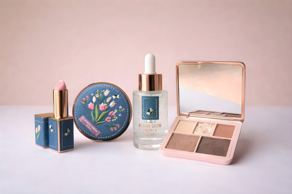 A material language that builds a brand. The packaging design is based on a central idea: transforming denim into an aspirational element within the world of cosmetics. To achieve this, we developed a visual system centered on textile textures and floral embroidery that bring warmth, detail, and a strong tactile and emotional component. Each piece was conceived as a desirable and collectible object. The contrast between the denim base—associated with everyday life—and the delicacy of the embroidery creates an aesthetic tension that elevates the product and sets it apart at the point of sale.